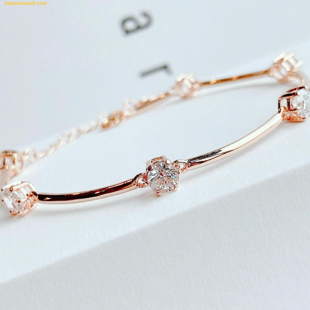 Thiết kế tinh tế: Vòng tay với những viên đá zirconia cắt tròn lấp lánh, nối với nhau bằng các liên kết mạ vàng hồng, tạo ra hình ảnh của những chòm sao trên bầu trời.
