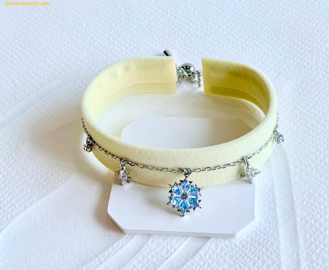 Thiết kế đậm chất: Hình dáng tinh tế của bông tuyết Swarovski, kết hợp với các viên đá zirconia xanh, mang đến cảm giác mới mẻ và khác biệt.