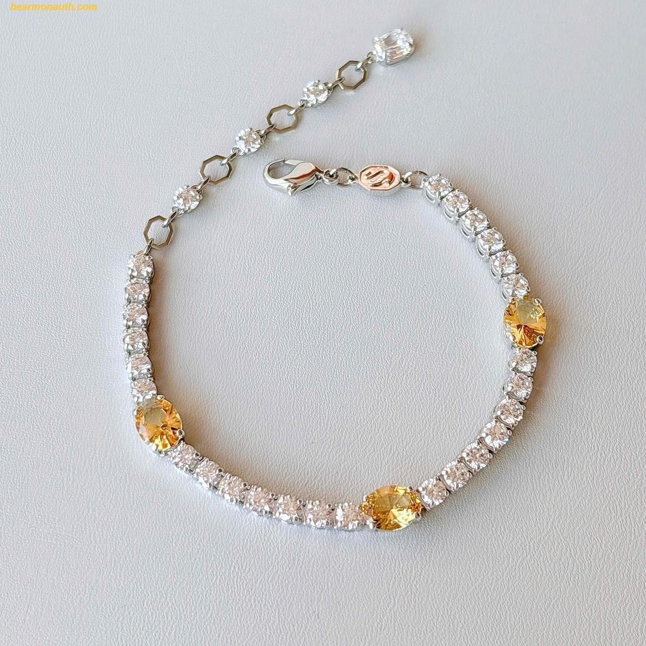 Đá quý lấp lánh: Với sự kết hợp hoàn hảo giữa các viên đá trong suốt và đá oval màu vàng, chiếc vòng mang đến vẻ đẹp lấp lánh bắt mắt và cuốn hút.